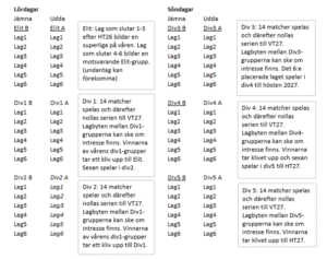 Elit A och B: Två jämnstarka Elitdivisioner spelar som vanligt 7 omgångar (14 matcher) på höstterminen. Topp tre i varje bildar en Superliga medan lag 4-6 i utgör Elit på VT27. Alla lag från Superligan är kvalificerade för Elit hösten 2027. De lag som slutar på 5:e och 6:e plats i Elit på våren spelar i Div1 på hösten 2027.